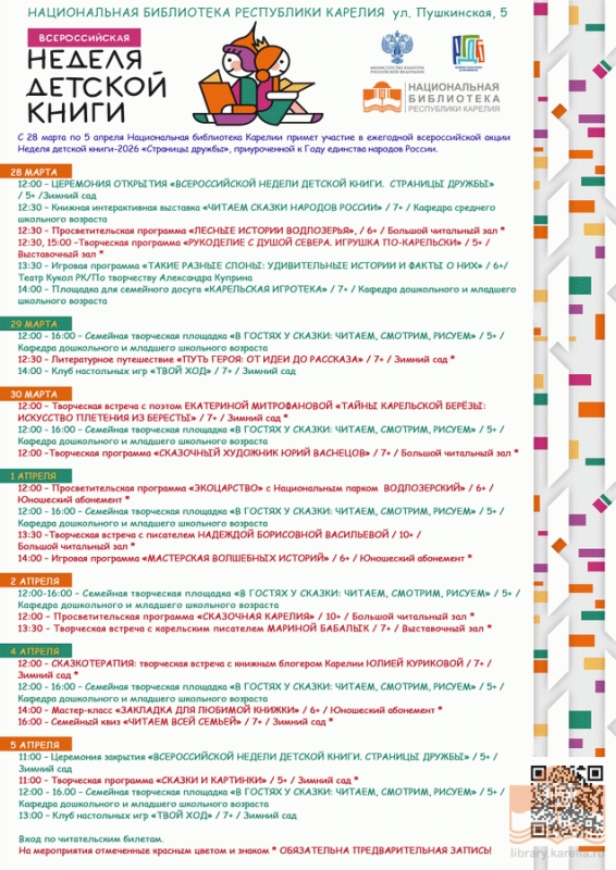 С 28 марта по 5 апреля Национальная библиотека Карелии принимает участие в ежегодной всероссийской акции Неделя детской книги. Неделя детской книги-2026 «Страницы дружбы» будет приурочена к Году единства народов России. В течение недели пройдет насыщенная программа мероприятий и ярких событий. 24 марта 2026 В апреле стартует приём работ на республиканский конкурс юных стихотворцев «Надежда» имени поэта Владимира Морозова