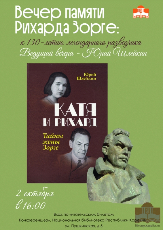 Вечер памяти Рихарда Зорге: к 130-летию легендарного разведчика 2 октября в 16:00 в Национальной библиотеке Республики Карелия состоится вечер памяти, посвящённый 130-летию со дня рождения Рихарда Зорге - выдающегося разведчика, журналиста и героя советской разведки, чьи действия в годы Второй мировой войны оказали решающее влияние на ход истории. подробнее » |