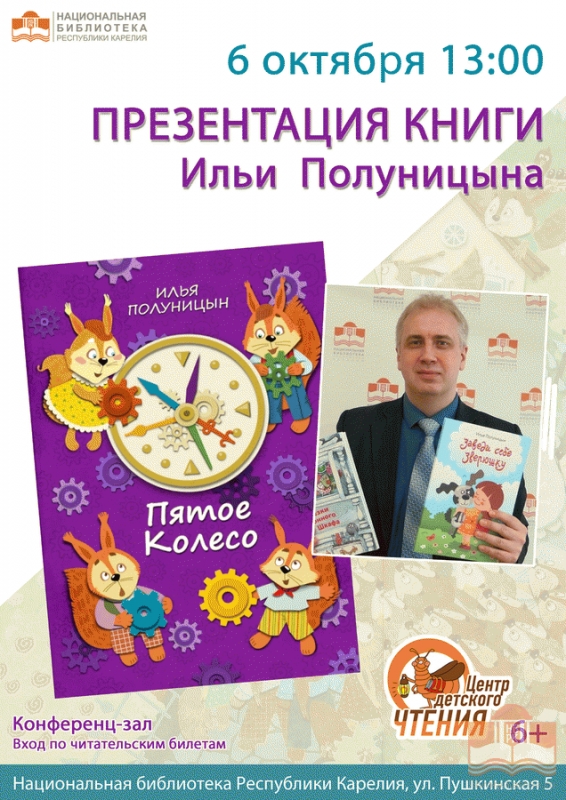 Презентация новой книги Ильи Полуницына Национальная библиотека Республики Карелия приглашает маленьких и взрослых любителей приключений на презентацию новой книги Ильи Полуницына «Пятое колесо». Событие состоится 6 октября в 13:00 в Большом читальном зале Национальной библиотеки. подробнее » |